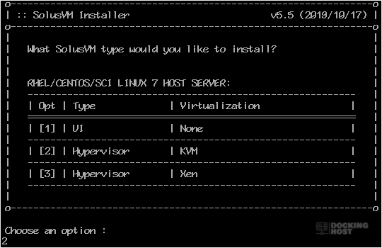 Step 2: For CentOS 7, It will show you the option to choose virtualization. Most people prefer KVM or Xen. Select your preferred virtualization by typing 2 or 3 and then press Enter. For KVM, we type 2 and then press Enter.